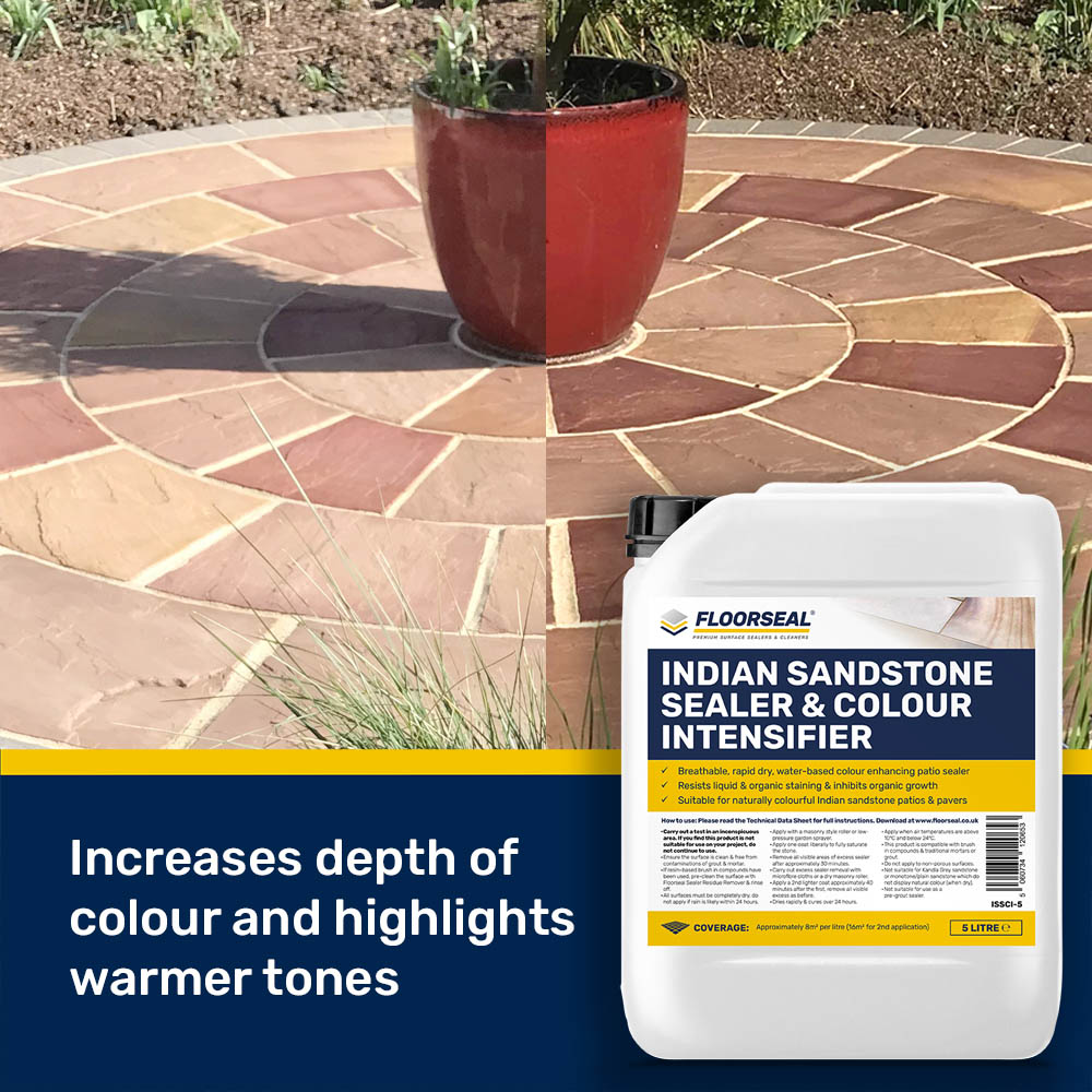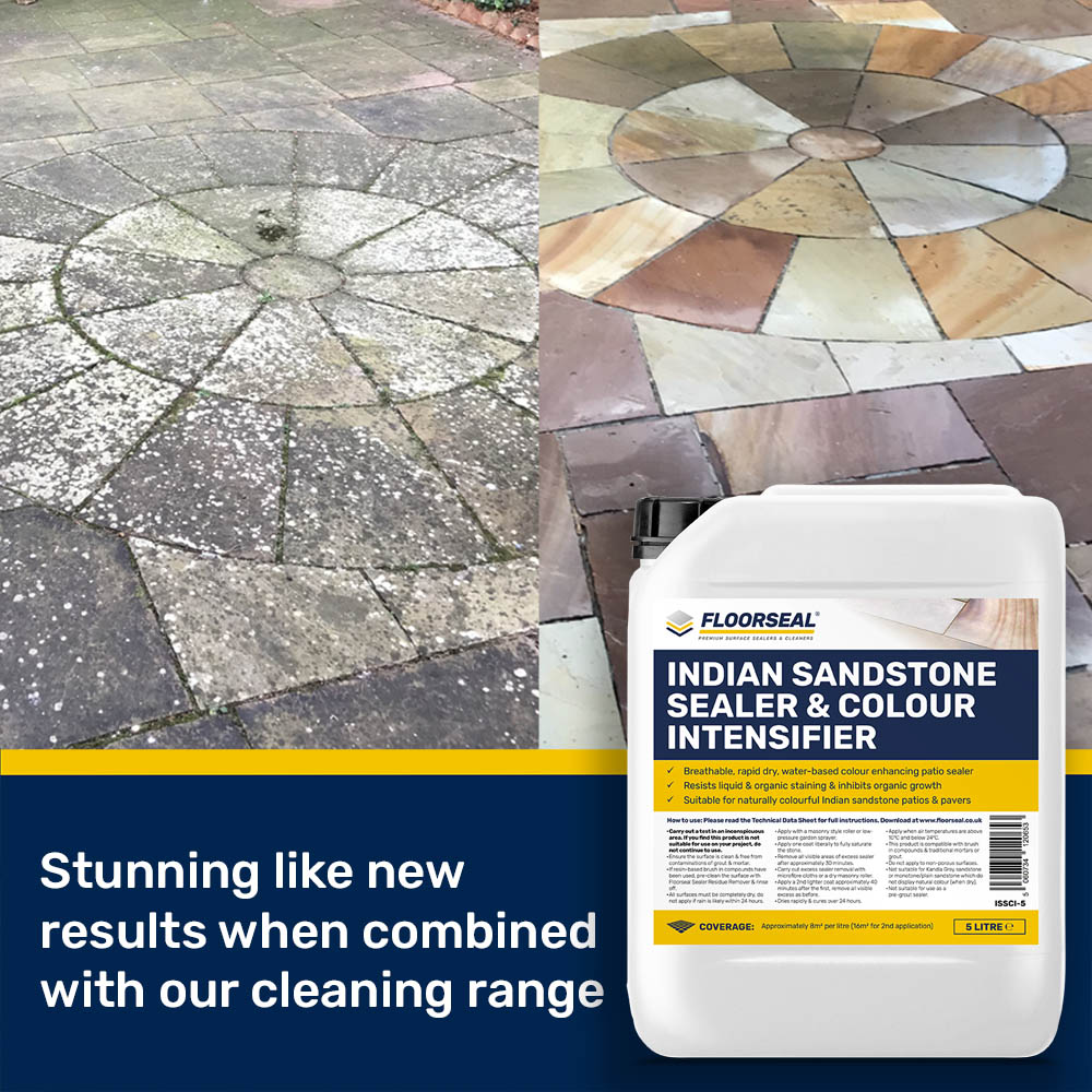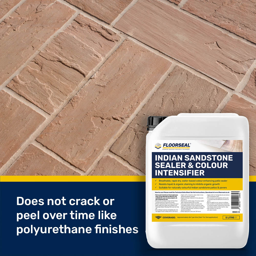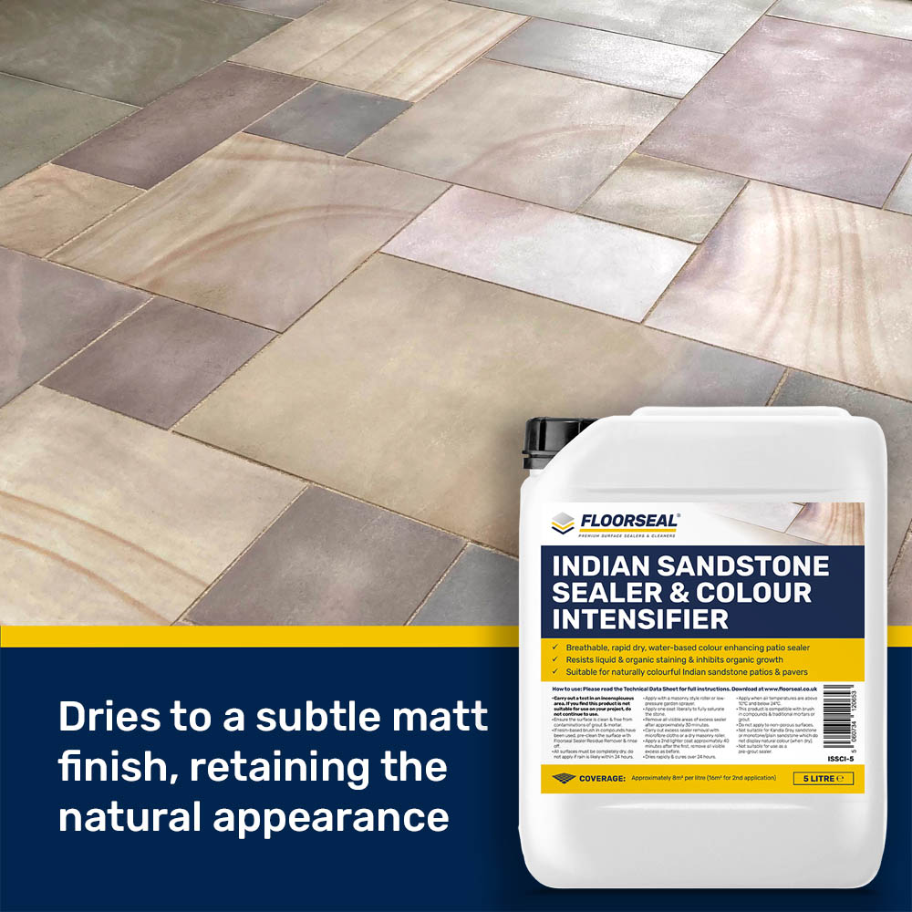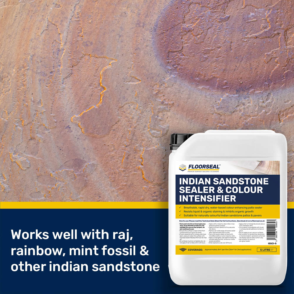 This subtle sandstone sealer has been specially formulated for sealing Indian sandstone patios and pavers. Indian Sandstone Sealer & Colour Intensifier is also suitable for other sandstones such as York sandstone, it can be used on internal floors. Exceptionally easy to apply and will create a subtle colour enriched matt finish. We highly recommend this product as an Indian stone sealer for external pavers and slabs. The sealer is water based, low odour and rapid drying. Indian sandstone often contains a large amount of colour which can be highlighted and subtly intensified. By using Floorseal Indian Sandstone Sealer & Colour Intensifier the natural colour contained within the stone will be enhanced. Indian Sandstone Sealer & Colour Intensifier seals the surface but is 100% breathable. The colour enhancing element of this sealer improves the appearance of the stone, whilst the impregnating element seals the surface. This natural stone sealer does not contain polyurethanes or surface forming lacquers which can blister, peel, crack, or flake over time. Does not contain any unpleasant solvents and is VOC free.