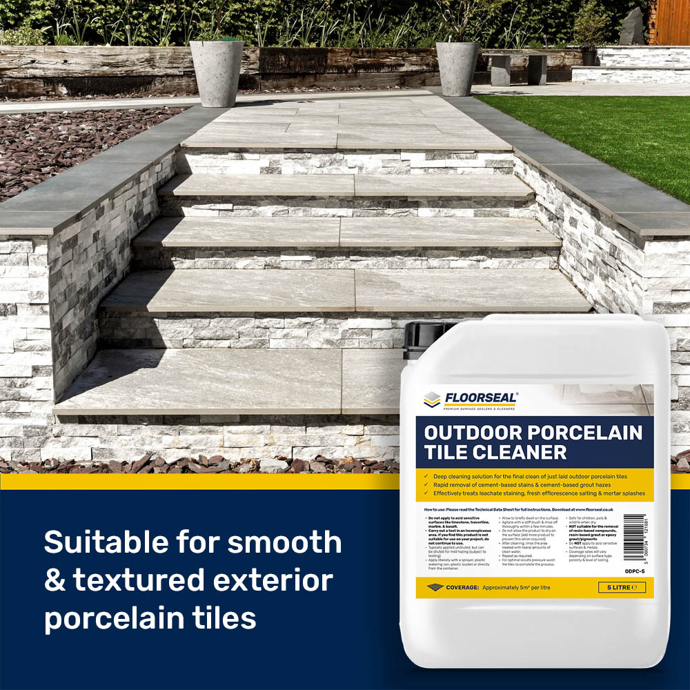 For best results pressure wash the surface after use. This porcelain slab cleaner is safe to use on any type of external porcelain tile where thorough cleaning of cement-based staining is required on smooth/textured porcelain tiles. The coverage rates will vary from 5m2 per litre and upwards, depending on the level of contamination and type/texture of the porcelain.