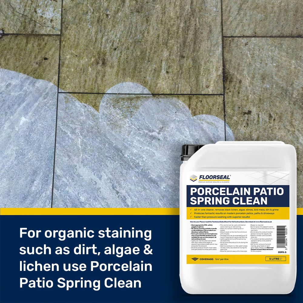 If you are cleaning up a porcelain patio after the winter (or for general ingrained grime), you may be interested in our Floorseal Porcelain Patio Spring Clean which specifically targets organic contaminations, such as lichen, green algae, slime, bird droppings, leaf staining & general grime.