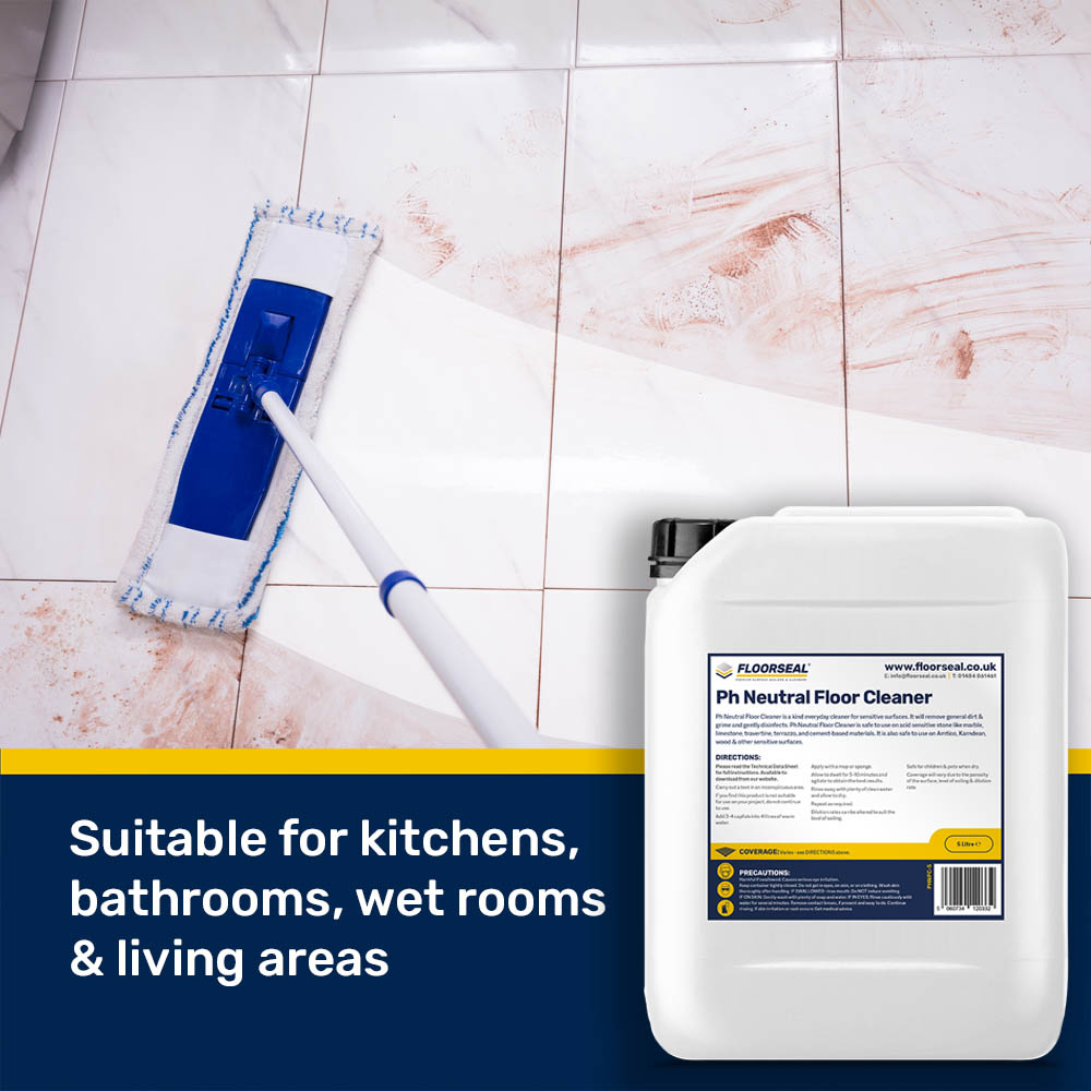 Floorseal Ph Neutral Floor Cleaner is particularly useful for cleaning sensitive surfaces or surfaces which have an existing coating. This could be anywhere which has had a surface polish or breathable impregnator applied. Ph Neutral Floor Cleaner will not have a negative effect on any surface due to its formula being Ph neutral, it is neither strongly alkaline or nor strongly acidic. This multi-surface cleaner is very economical, a little bit goes a very long way. Just a few capfuls of cleaner is to be diluted into 4 or 5 litres of clean water. A great product to use as a granite cleaner, marble cleaner, limestone floor cleaner, Amtico or Karndean floor cleaner. If you have a natural stone or tiled floor with an existing sealer, harsh cleaning products should not to be used. Strong cleaning agents are often highly alkaline and will strip or attack existing sealers. By using Ph Neutral Floor Cleaner the surface can be cleaned without removing any pre-existing sealers or polishes. Some natural stones are acid sensitive, notably marble, limestone and travertine. If these surfaces are cleaned with acidic based cleaners (typically limescale removers) you will etch the stone and dull the surface. This etching will become obvious on polished or semi-polished marbles, limestones and travertine. By cleaning with a ph neutral cleaner acid sensitive stone can be cleaned without damage.