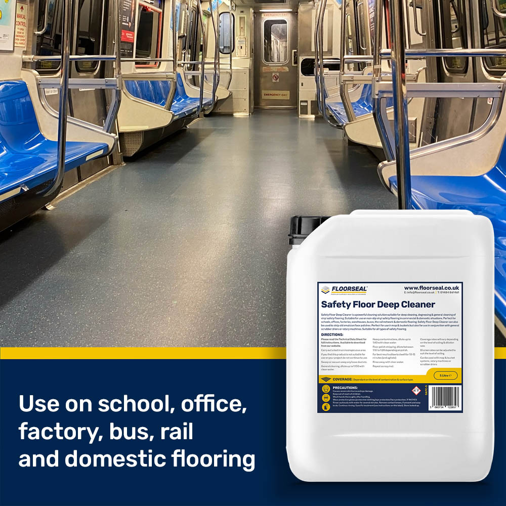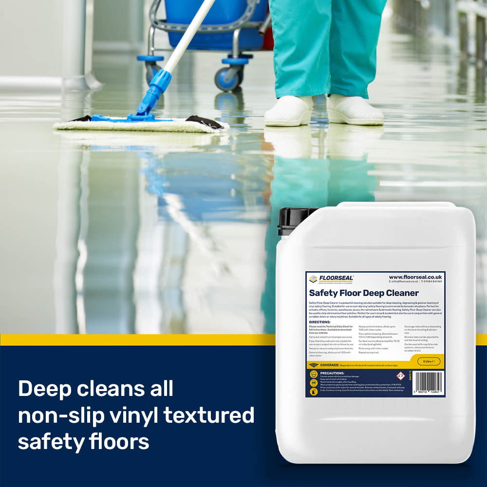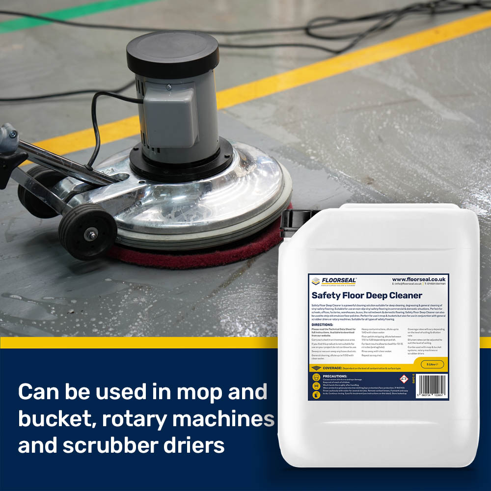Safety Floor Deep Cleaner can also be used to strip old emulsion floor polishes. Perfect for use in mop & buckets but also for use in conjunction with general scrubber driers or rotary machines. Suitable for cleaning all types of safety flooring.